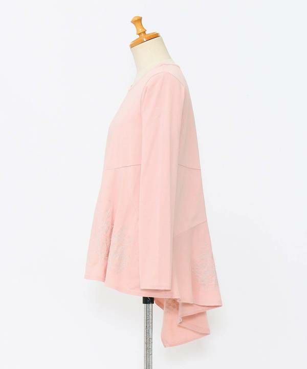 ボタニカルなハーブ系の草花の刺繍を裾のアシンメトリーのフレア部分に施しました。彩度を合わせた刺繍の糸が、やさしく語りかけます。