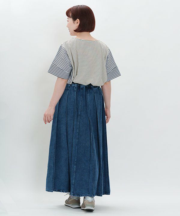 カジュアルなデニム素材ながらも、プリーツの縦ラインがスタイルアップを叶え、上品な雰囲気もプラスします。