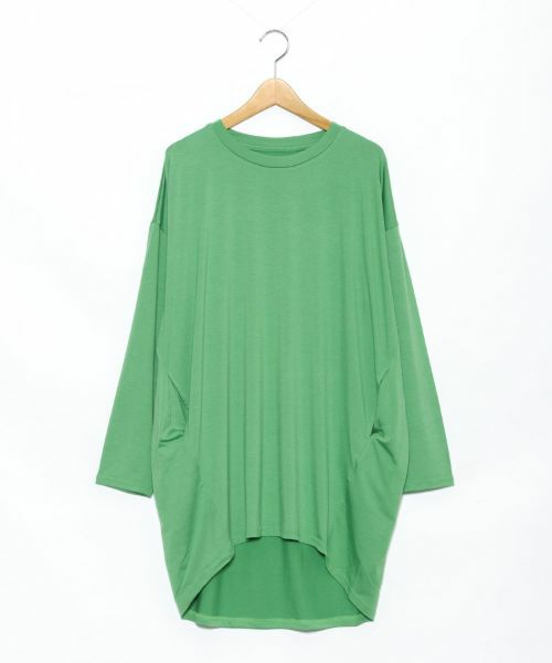 大きめBODYの裾をコクーンにしたことでスッキリして見え、切替線を前にまわすことで細見え効果のあるチュニックとなっています。