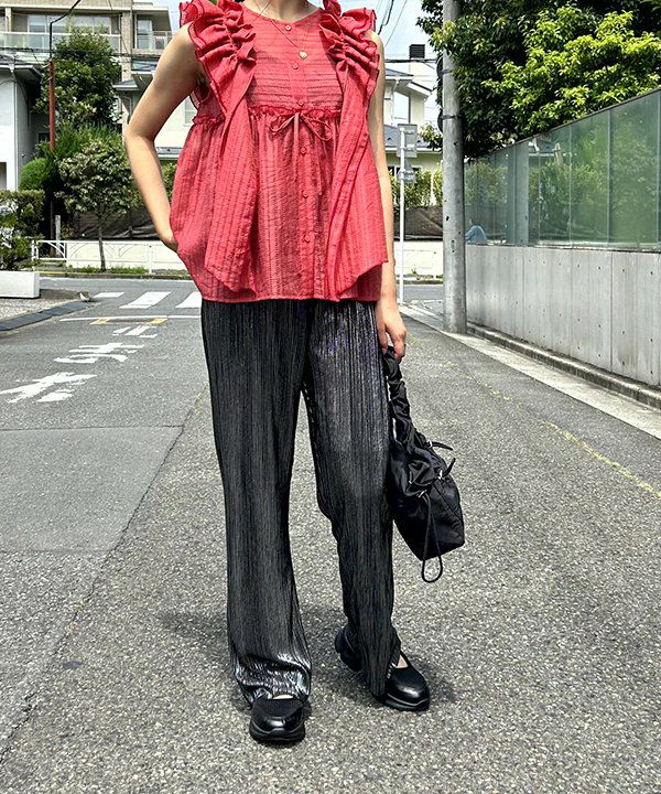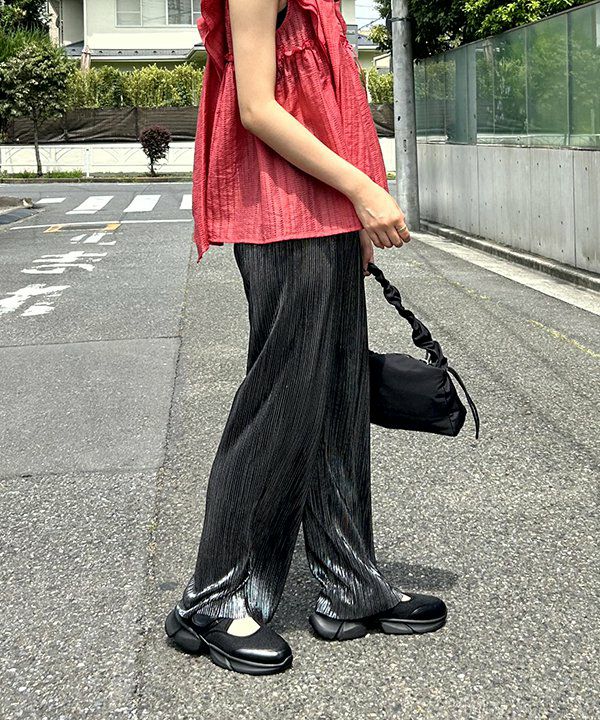 光を受けて美しく煌めくラメ入りプリーツパンツで、どんな日も特別に。軽量な素材と伸縮性のあるウエストゴムで、快適に動けるのにスタイルは抜群。動くたびに裾がゆらぎ、立体的なシルエットを演出。本当に使いやすいアイテムで、あなたの個性を引き立たせてくれます。