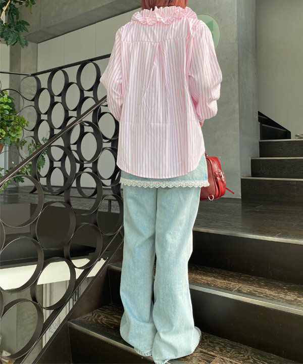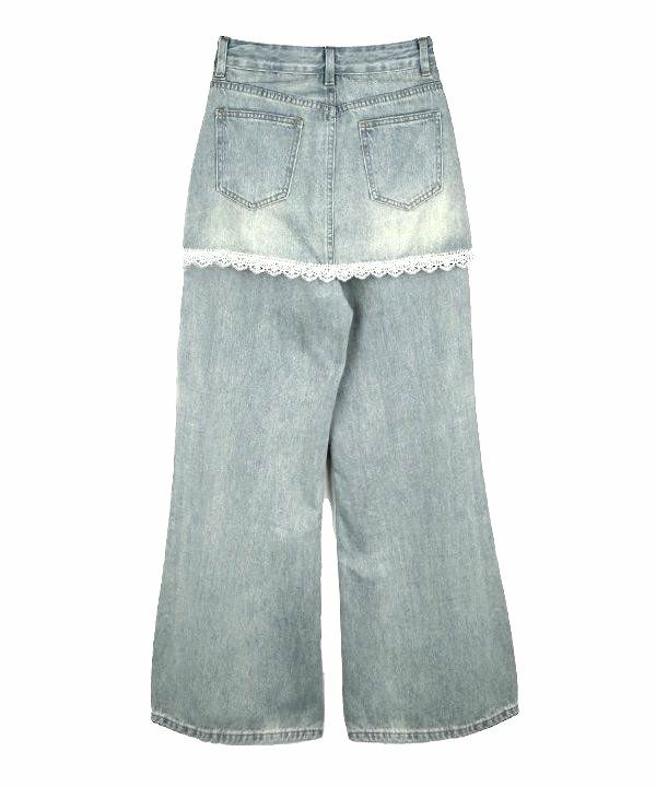 デニム特有のカジュアルさに、繊細なレースを重ねたレイヤード風パンツ。裾からちらりと覗くレースがポイントで、それだけでスタイリッシュに決まります。普段のコーディネートに少し特別感をプラスしたい方にぴったりな一枚です。