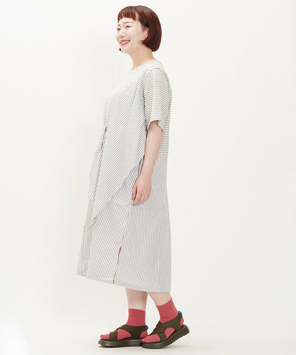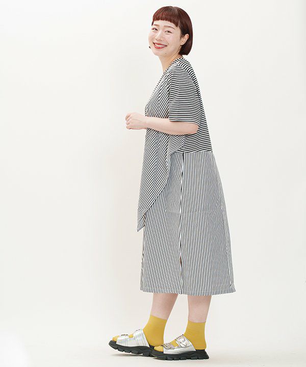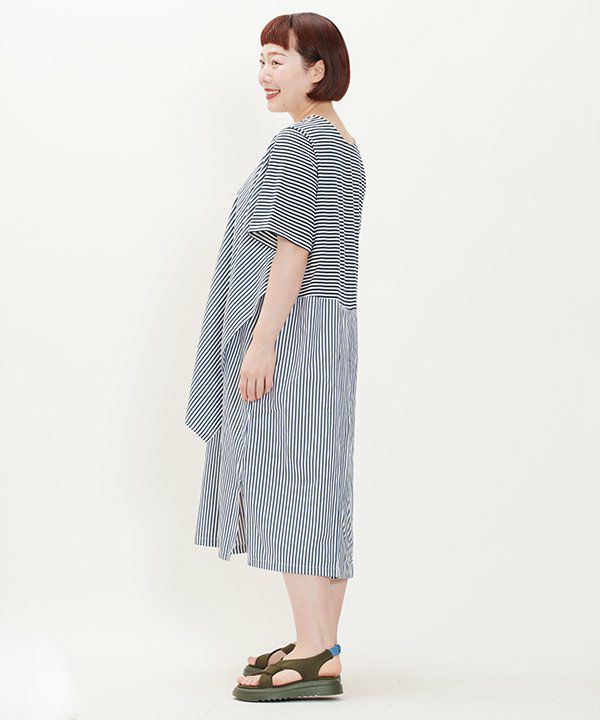ボーダーのカットソー素材に布帛の先染めボーダーを重ねたワンピースです。