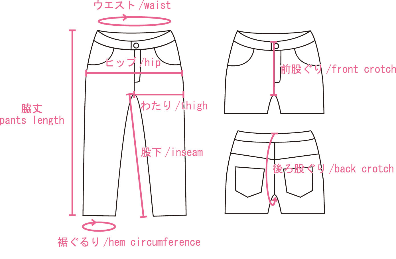 後ろ股ぐり/back crotch:内股の合わせからウエストの後ろ中心までの長さ