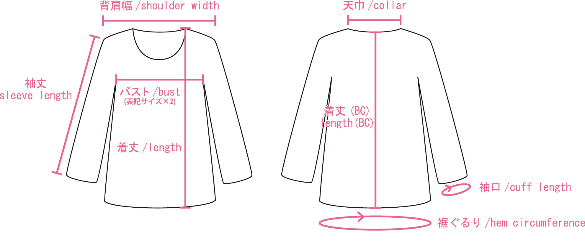 着丈(BC)/length(BC):後ろ衿ぐりの中央から裾までの長さ