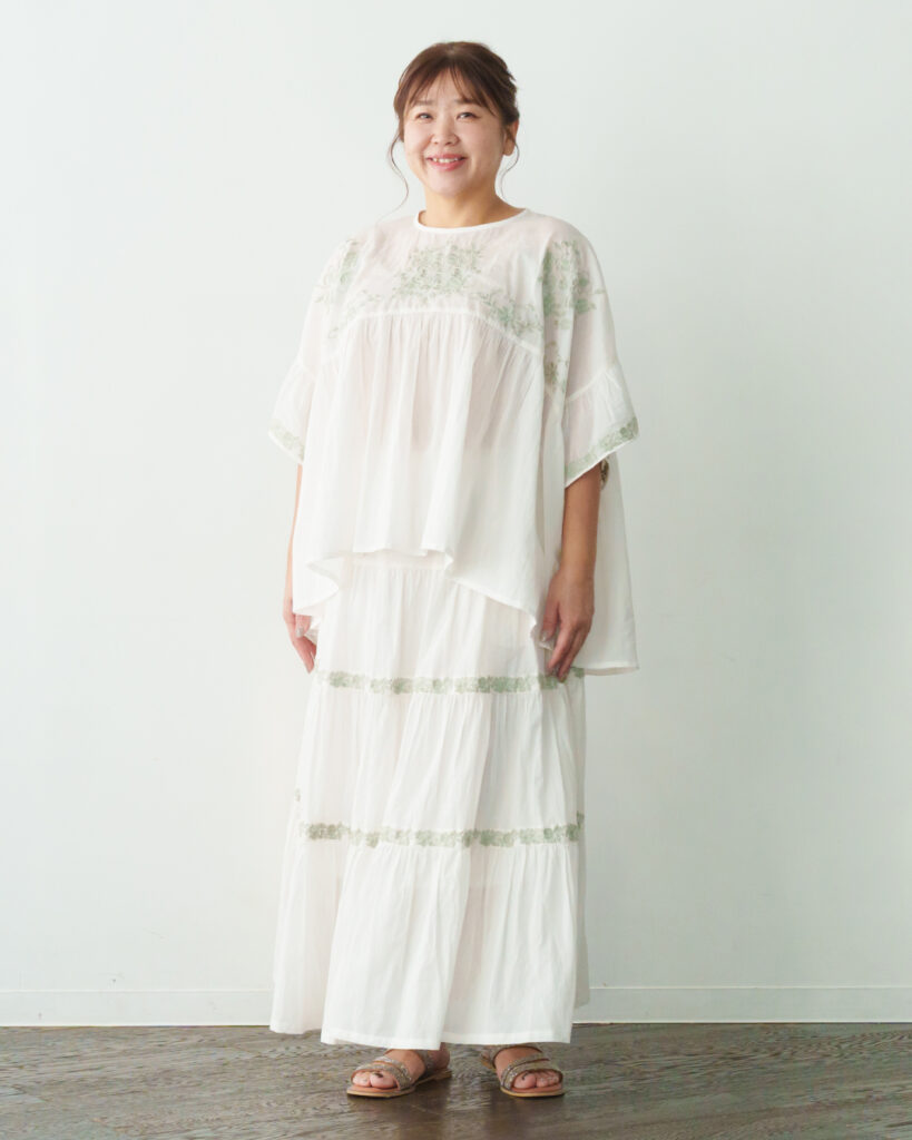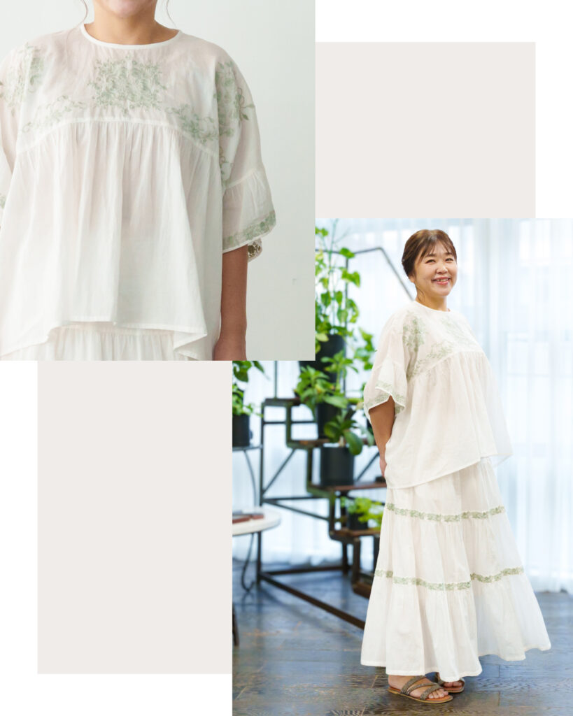 ブラウスは身頃とお袖に施した刺繍が華やかな印象に◎