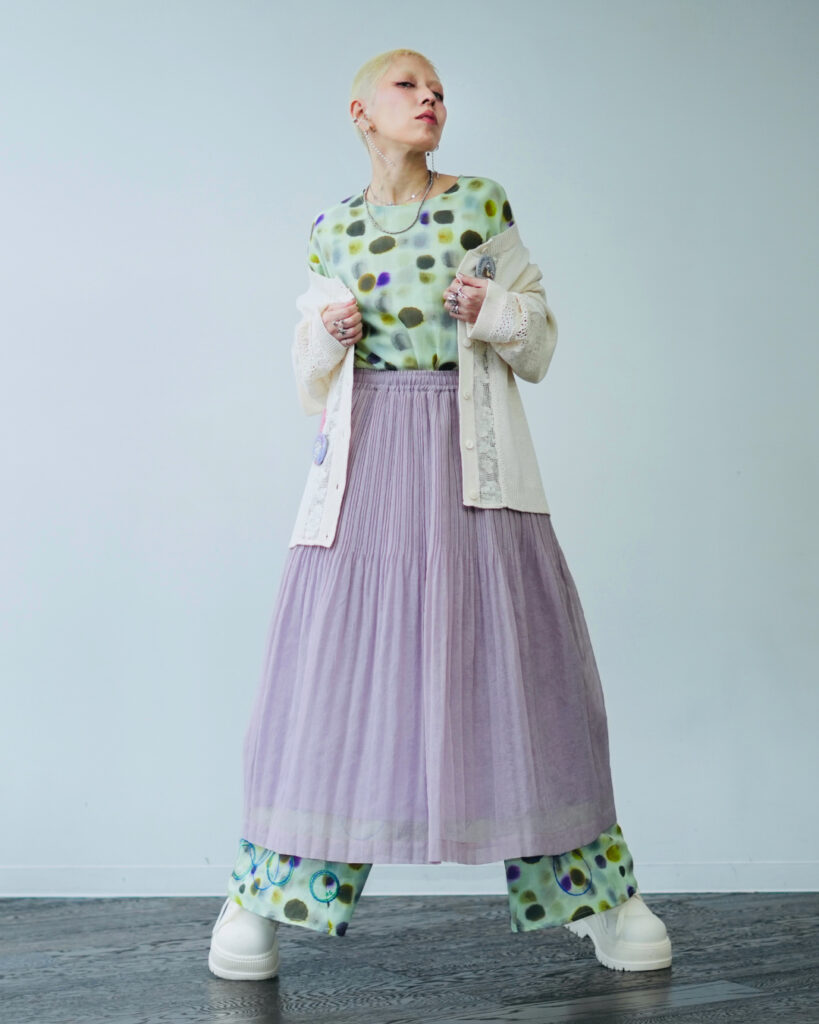 プリーツスカートを重ねた、奥行きのあるスタイル。